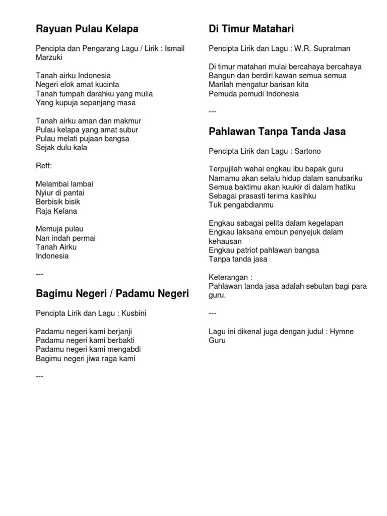 Lagu Wajib Nasional Ri Di Timur Matahari Lirik Youtube