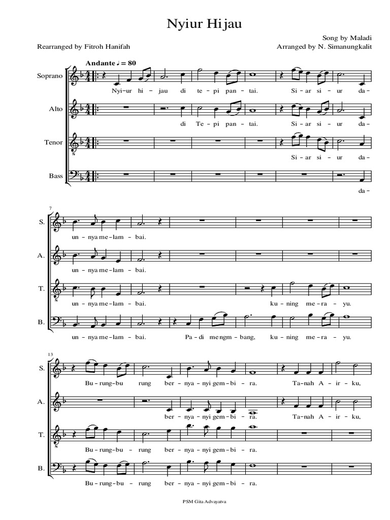 Not lagu nyiur hijau. Com nyiur hijau di tepi pantai siar siur daunnya melambai padi mengembang kuning merayu burung burung bernyanyi gembira. Various artists nyiur hijau vocal chorus version pt. Notasi angka dan notasi balok lagu wajib syukur cipt h.