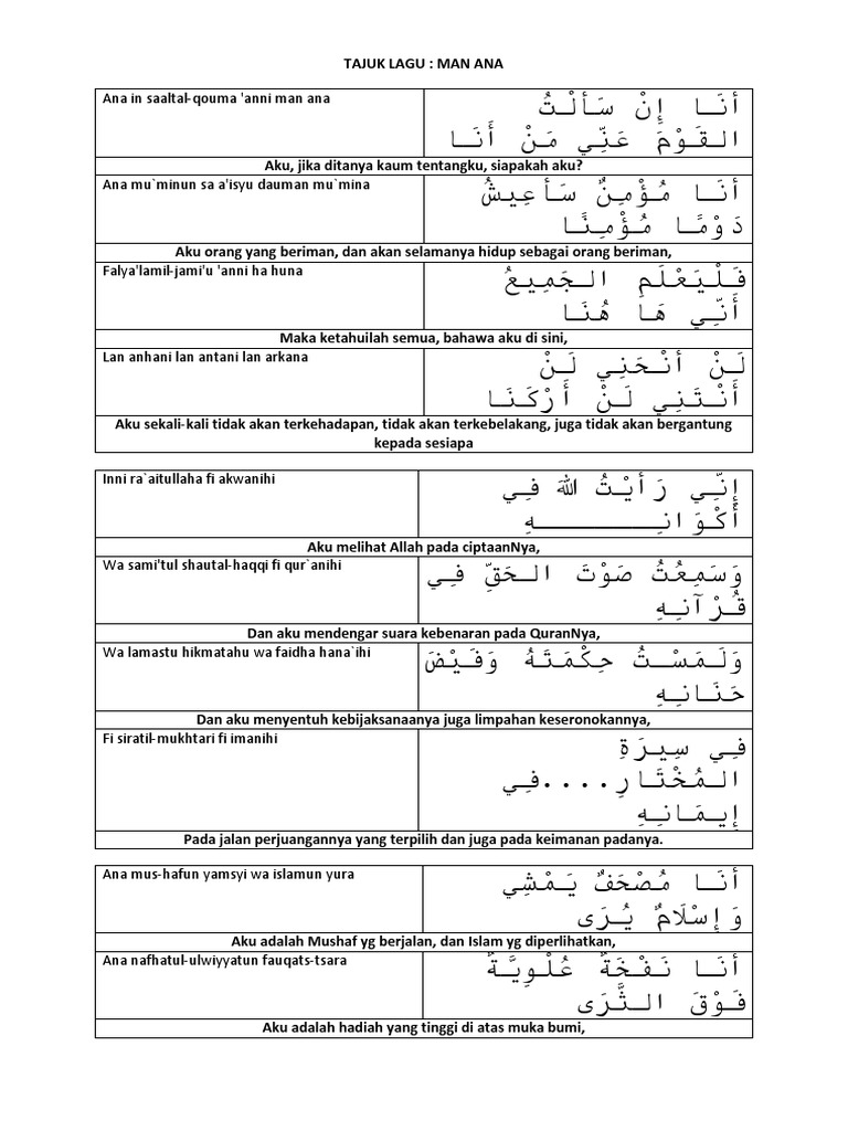 Berikut dibawah ini adalah teks lengkap lirik lagu man ana arab latin beserta artinya ke dalam bahasa indonesia yang dinyanyikan ai khodijah.